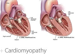 Cardiomyopathy literally means "heart muscle disease" It is the deterioration of the function of the myocardium (i.e., the actual heart muscle) for any reason. People with cardiomyopathy are often at risk of arrhythmia and/or sudden cardiac death.